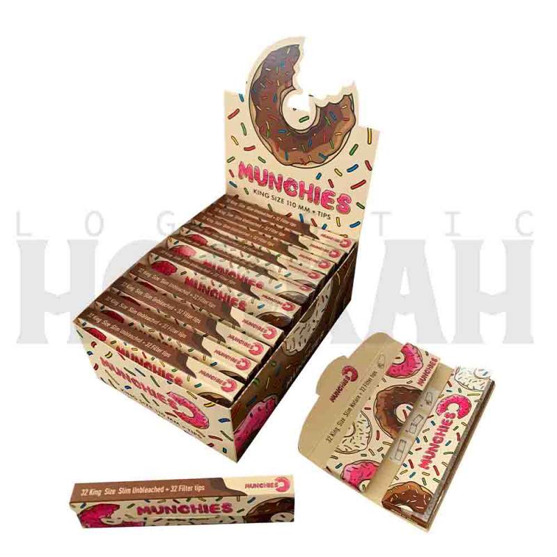 Librillos de papel y filtros para fumar Pack Munchies KS, de la marca Monkey King. Cada expositor contiene 24 librillos y, cada librillo, 32 hojas de papel y 16 doble filtros.