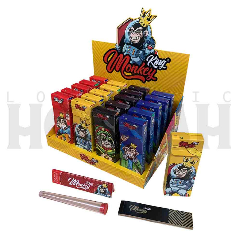 Monkey Pack Portaconos, un pack de papel de fumar, filtros y portaconos de la marca Monkey King. Cada expositor contiene 20 librillos (32 hojas de papel y 16 dobles filtros) y 20 portaconos.